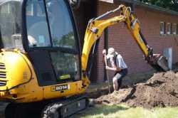Cord-Lüder baggerte sich um das Vereinsheim herum, entlang der Tennisplätze 1+2+3 bis zum Zaun am Holzhaus auf dem Beachplatz.